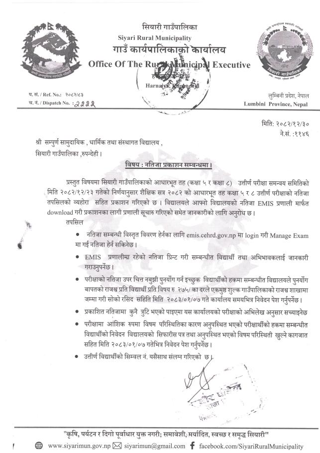 आधारभूत तह उत्तीर्ण परीक्षा (कक्षा ८) र (कक्षा ५) को नतिजा प्रकाशन गरिएको सूचना।