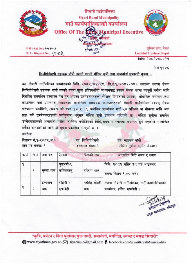 फिजियोथेरापी सहायक पाँचौतहको पदको अन्तर्वार्ता सम्बन्धी सूचना