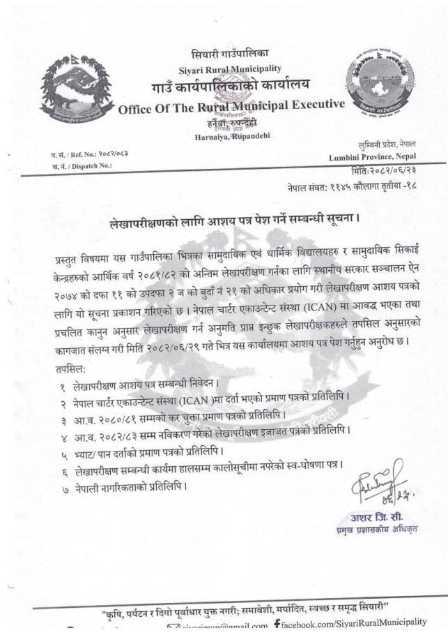 लेखा परिक्षणका लागि आशयपत्र पेश गर्ने सम्बन्धी सूचना ।।