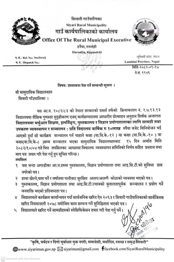 सियारी गाउँपालिका अन्तर्गतका सामुदायिक विद्यालयहरुबाट प्रस्तावना पेश गर्ने सम्बन्धी सूचना ।।