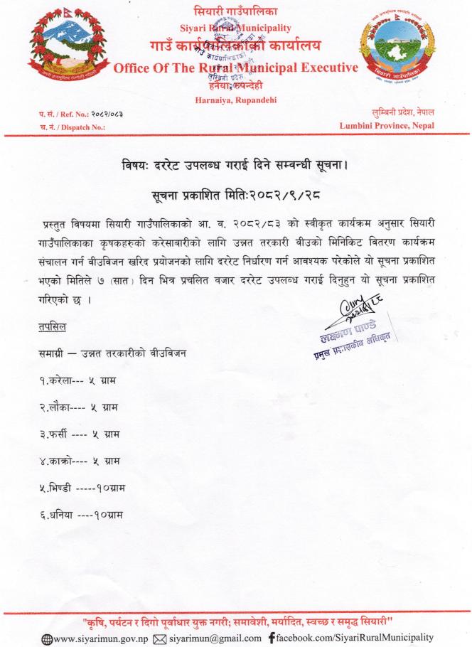 दररेट उपलब्ध गराइदिने सम्बन्धि सूचना ।