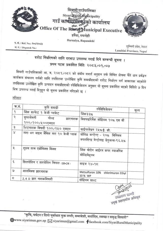 दररेट निर्धारणको लागि दरभाउ उपलब्ध गराईदिने सम्बन्धी सूचना ।।