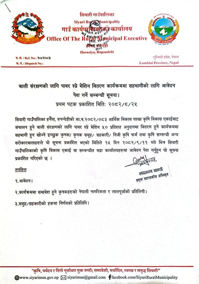 बाली संरक्षणको लागि पावर स्प्रे मेशिन वितरण कार्यक्रममा सहभागीको लागि आवेदन पेश गर्ने सम्बन्धी सूचना ।।