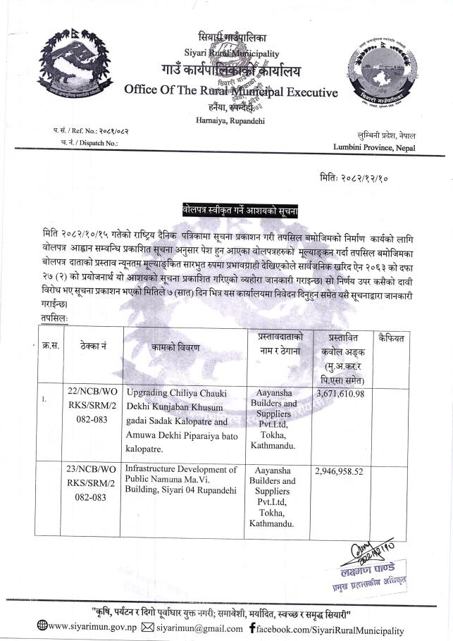 बोलपत्र स्वीकृत गर्ने आशयको सूचना ।।