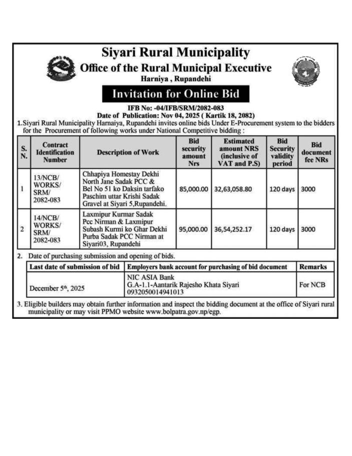विद्युतीय बोलपत्र आह्वान सम्बन्धी सूचना ।।