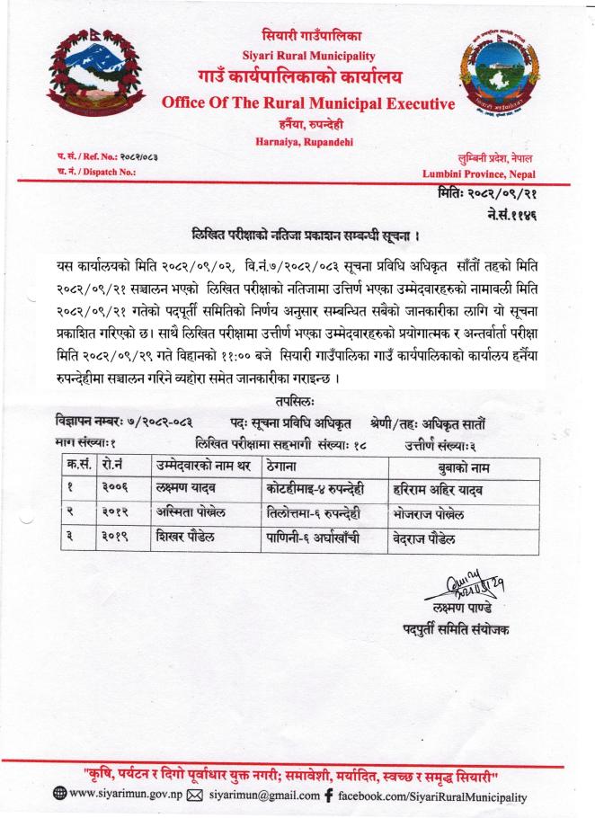 सूचना प्रविधि अधिकृत सातौं तहको पदको लिखित परीक्षाको नतिजा प्रकाशन सम्बन्धी सूचना ।।