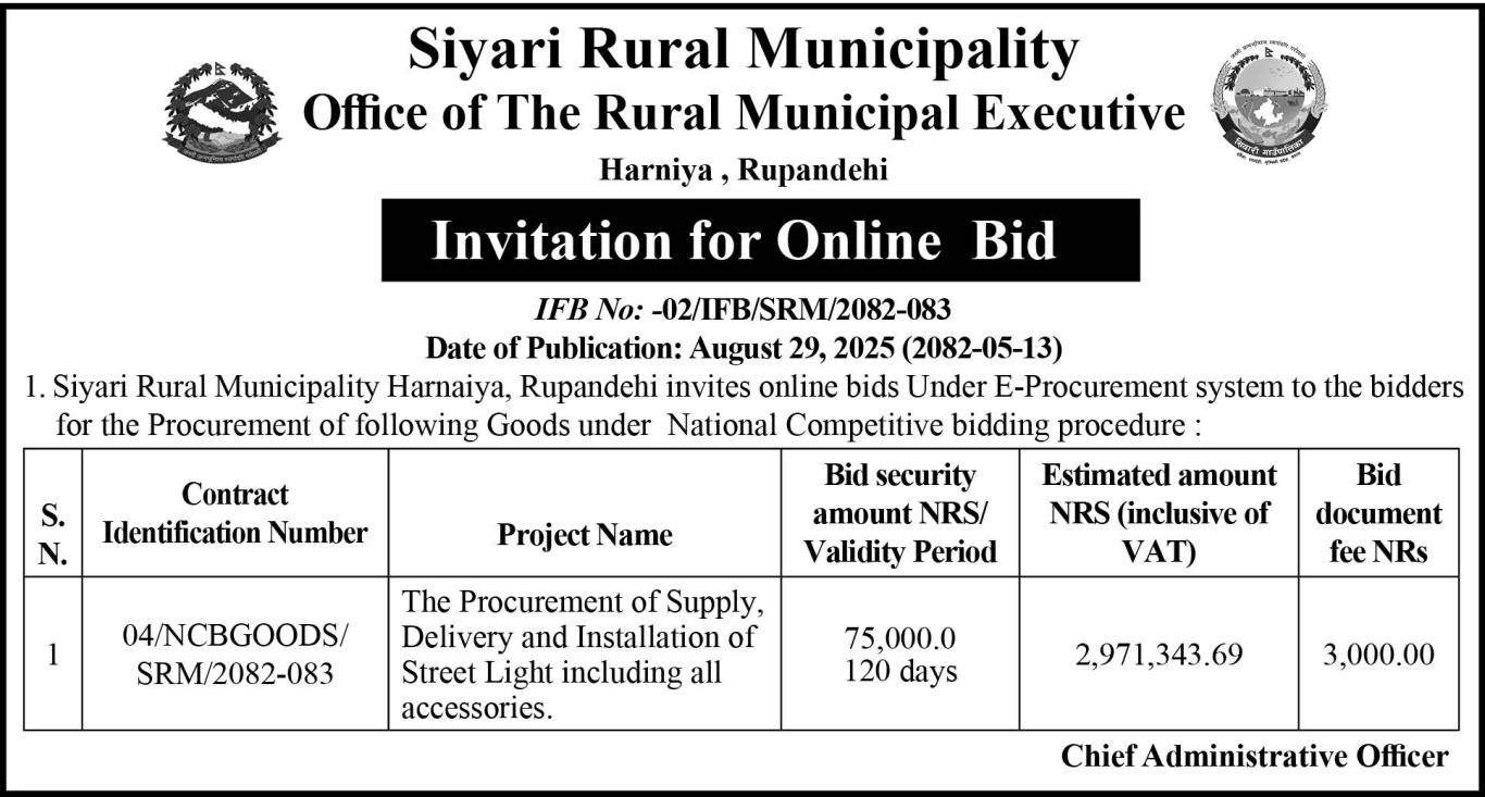 Invitation for bid for Procurement of Street Lights (02/IFB/SRM/2082-083)